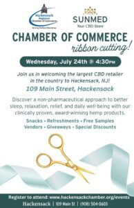 The Hackensack Chamber of Commerce is excited to announce a ribbon-cutting ceremony for Sunmed CBD, located at 109 Main Street, Hackensack, on July 24th at 4:30 PM. This celebratory event will be followed by an after-hours networking session designed to bring together small business owners and professionals from the community. Join us for an evening of connection, celebration, and support for local business growth.