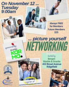 Join us for a dynamic morning of networking at Bergen Marble & Tile in Ridgefield, NJ, on November 12th! Hosted by the Hackensack Chamber of Commerce, this event offers a fantastic opportunity to connect with local professionals, exchange ideas, and expand your business network. Start your day with coffee, light refreshments, and engaging conversations in a welcoming atmosphere. Don’t miss this chance to build meaningful connections and discover potential partnerships. We look forward to seeing you there!