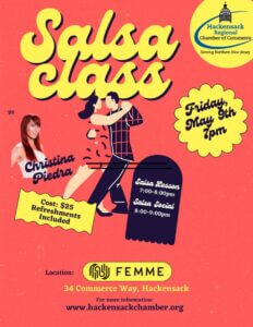 Join the Hackensack Regional Chamber of Commerce for a fun and lively Salsa Night on Friday, May 9th at Femme in Hackensack! The evening kicks off with a 1-hour Salsa lesson—perfect for beginners or anyone looking to brush up on their moves—followed by a Salsa Social, where you can dance the night away and put your new skills to the test. No partner needed—just bring your energy and get ready for a night of music, movement, fun!