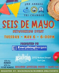 Join the Hackensack, Fort Lee, and Hudson Latino Chambers of Commerce for a vibrant evening of networking, culture, and celebration at our Seis de Mayo Tri-Chamber Fiesta! This unique event brings together professionals from three dynamic communities to connect and collaborate in a festive atmosphere.
